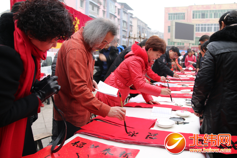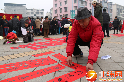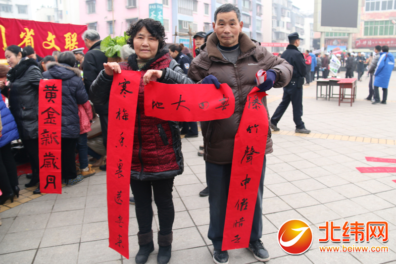最忙、最热闹的应该是春联赠送现场。只见书法家们挥毫泼墨,手不停歇地书写着,刚刚写好一副,赶快就被群众拿走。