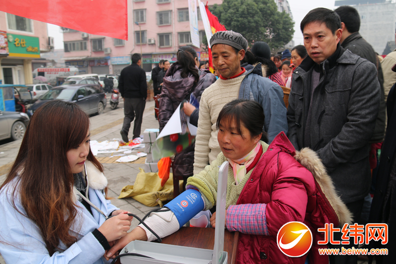 义诊台前,也是人头攒动。男女老少有序排着队测量血压、询问身体状况。