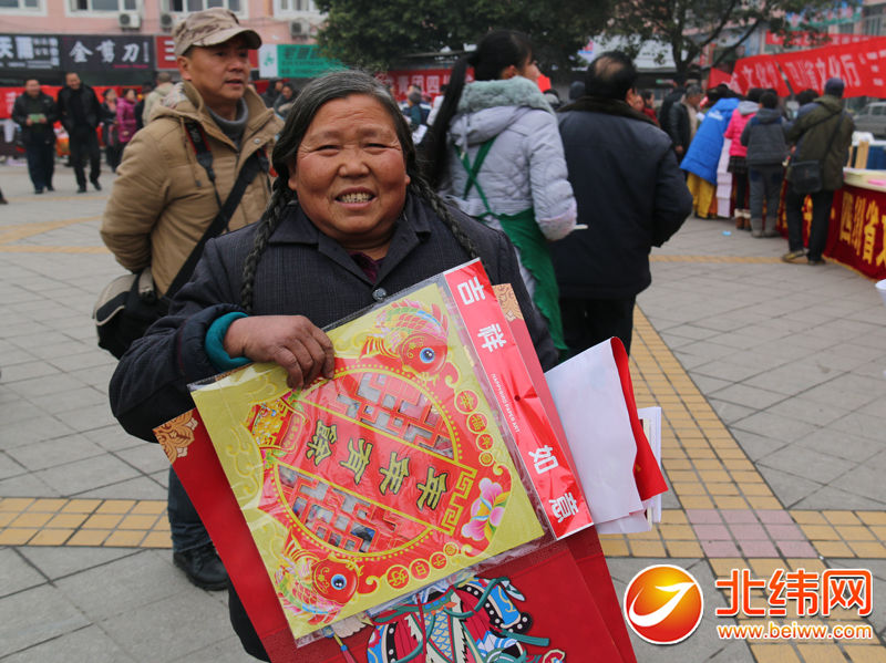 陈大娘领到了对联,挂历等,笑得乐呵呵!