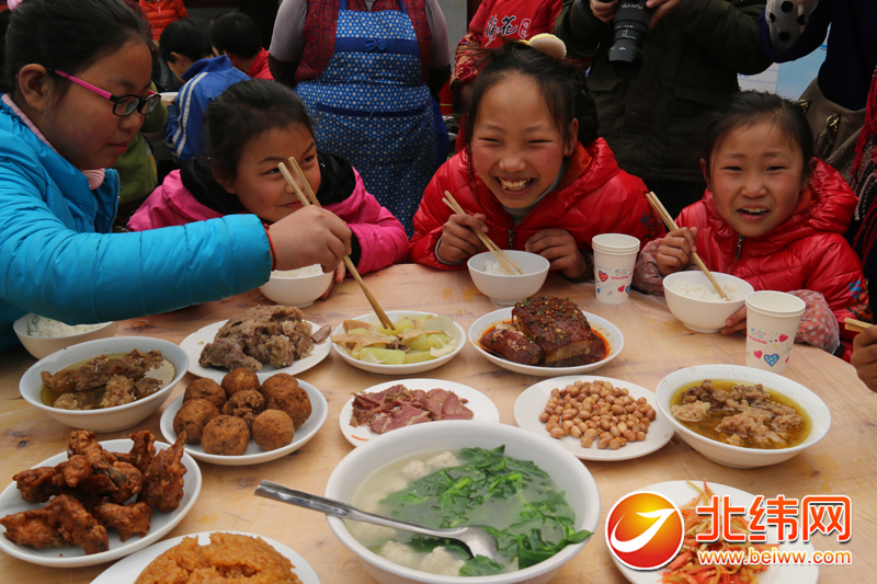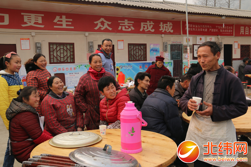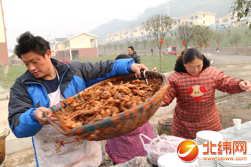 小孩成群嬉戏,大人忙着炒菜做饭、搬桌椅,当天中午,新村聚居点的院坝里充满了欢声笑语。 中午12点,黎明新村坝坝宴正式开宴,一碗碗热气腾腾的菜如流水般端上了桌子,每桌共九道菜,有油炸鱼条、炸圆子,粉蒸排骨、凉拌鸡……每一道菜都是香气扑鼻、令人馋涎欲滴。乡里乡亲共同举杯,相互说着祝福的话语,大家脸上都洋溢着乔迁新居、迎接新年的喜悦之情。