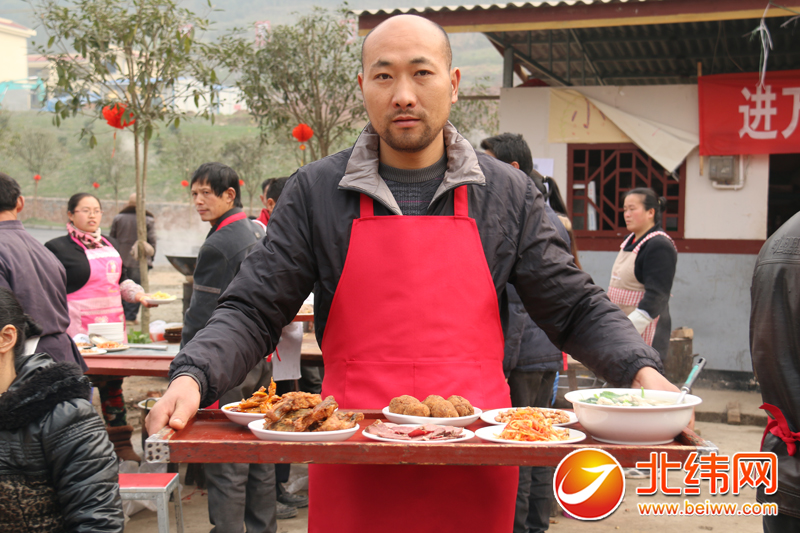 中午12,坝坝筵开席,当地村民用长盘将一碗碗热气腾腾的菜端上了桌子