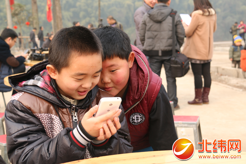 两个小朋友正在玩手机游戏,等待开饭。