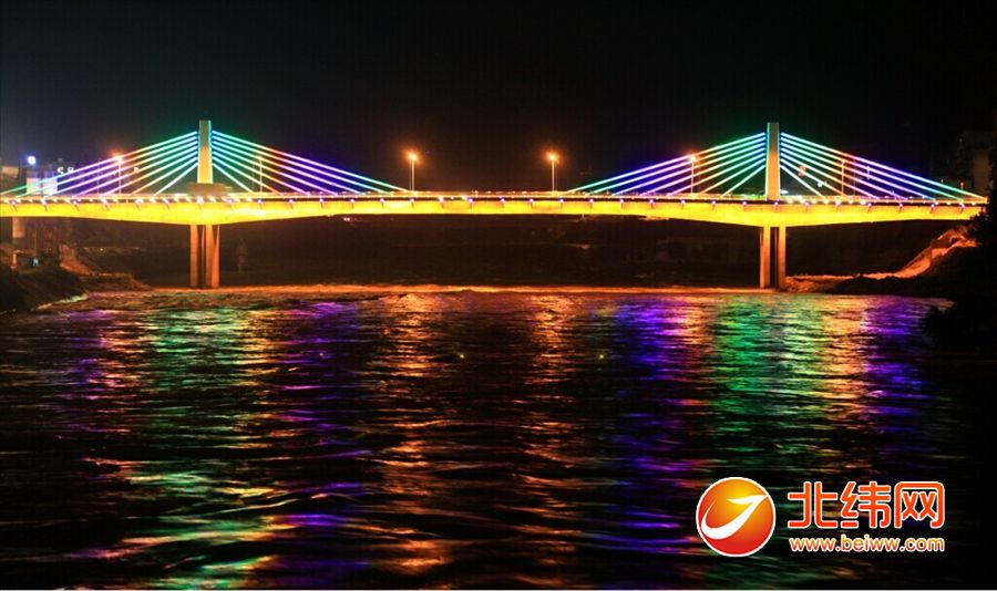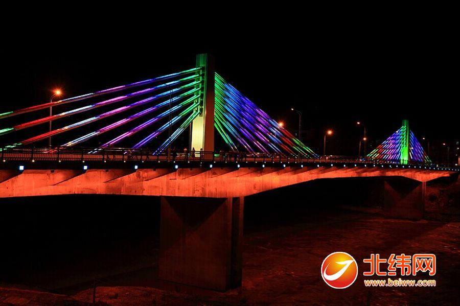 据悉,该桥全长251.4米,宽22米,设计为双向4车道,中间设3米斜拉索保护区,两侧人行道各宽2.5米,总投资约4500万元。作为该桥的亮点之一,由1830只数码LED灯管、90盏LED方灯、196盏射灯、100盏高压钠灯组成的亮化工程,将该桥“打扮”的让人眼前一“亮”。其中,桥身双塔斜拉绳上的LED数码管由微电脑控制,交替闪烁组成同步动画实现远景视觉效果。而双塔左右两端采用绿色和白色光源照射塔柱,使桥面达到梦幻效果。大桥两侧配制的LED方灯和射灯则大大地增加大桥夜晚立体视觉效果,大桥底面采用70W高压纳灯照射桥底形成光差,使桥面与桥底层次感突出。